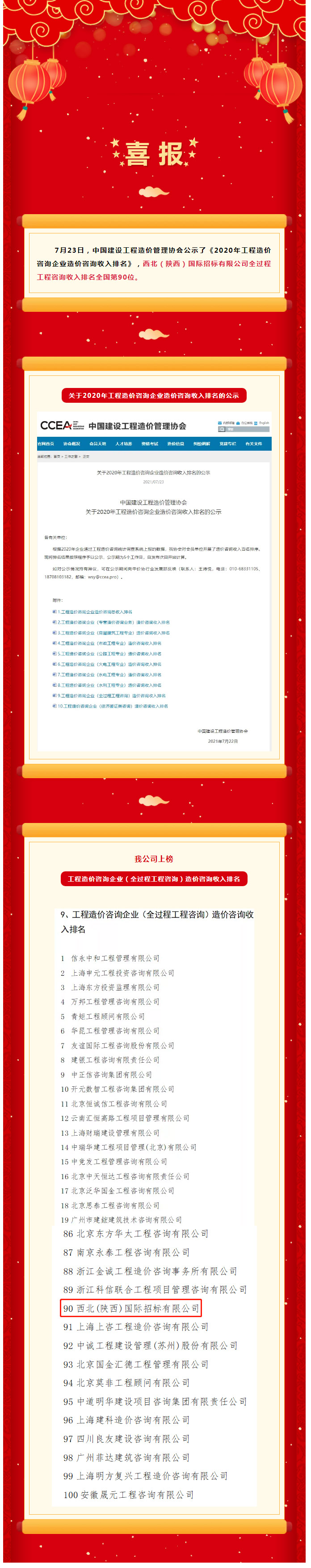 2020年工程造價咨詢企業(yè)造價咨詢收入排名公示!我公司進(jìn)入100強(qiáng)!