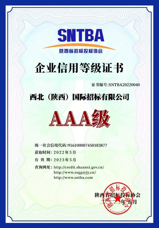 熱烈祝賀我公司榮獲2022年陜西省招投標(biāo)協(xié)會《AAA級企業(yè)信用等級證書》