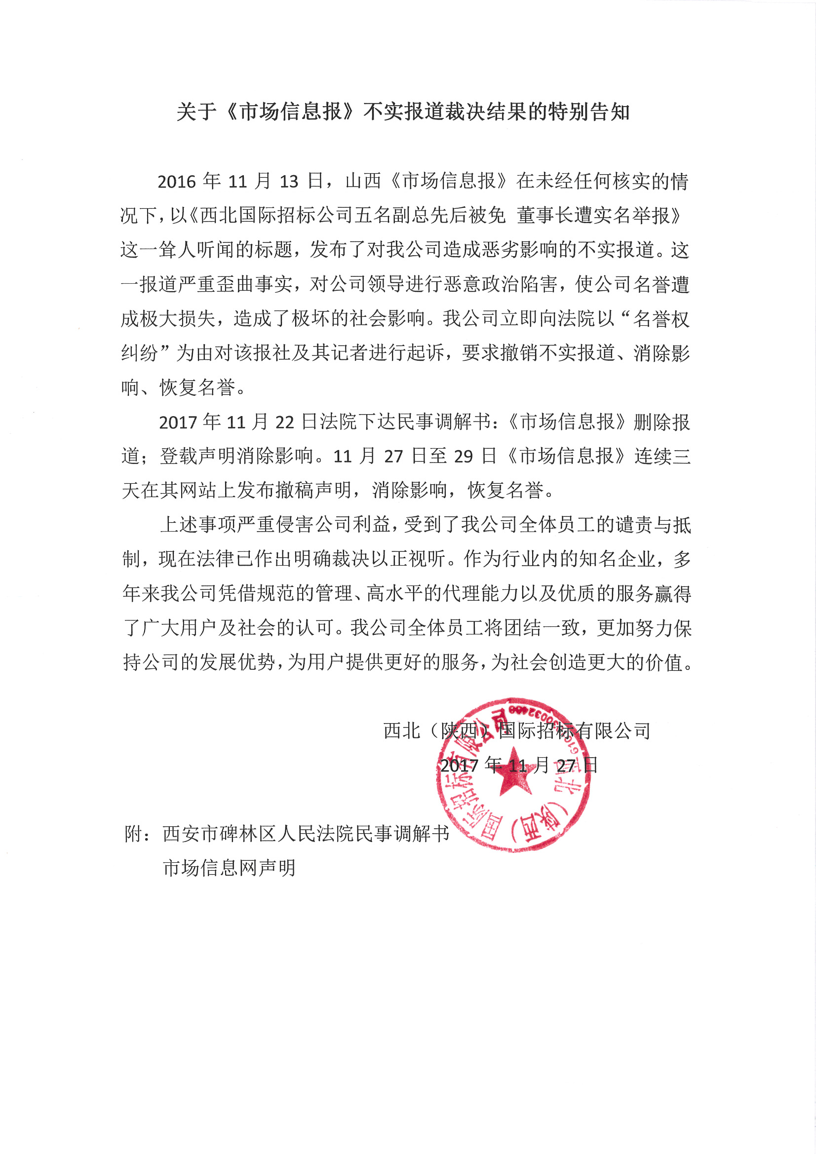 關(guān)于《市場(chǎng)信息報(bào)》不實(shí)報(bào)道裁決結(jié)果的特別告知