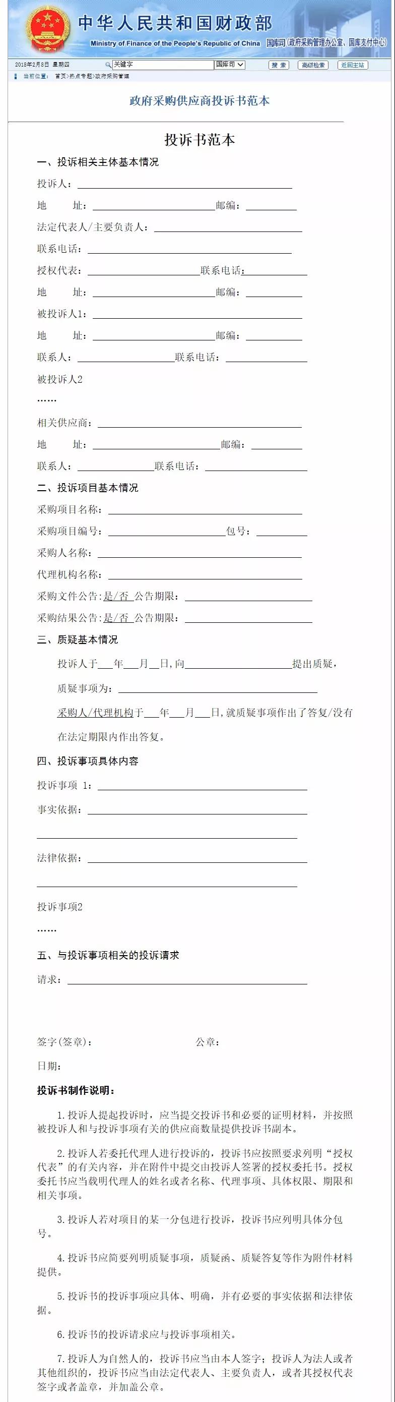 財(cái)政部發(fā)布政府采購質(zhì)疑和投訴書范本