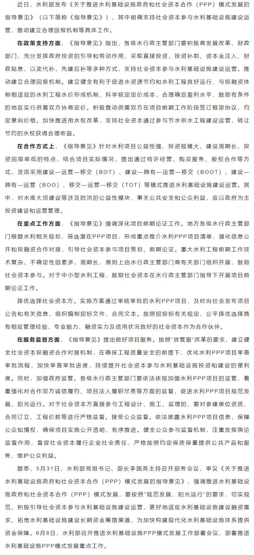 水利部|支持社會資本參與水利基礎(chǔ)設(shè)施PPP項目建設(shè)運營